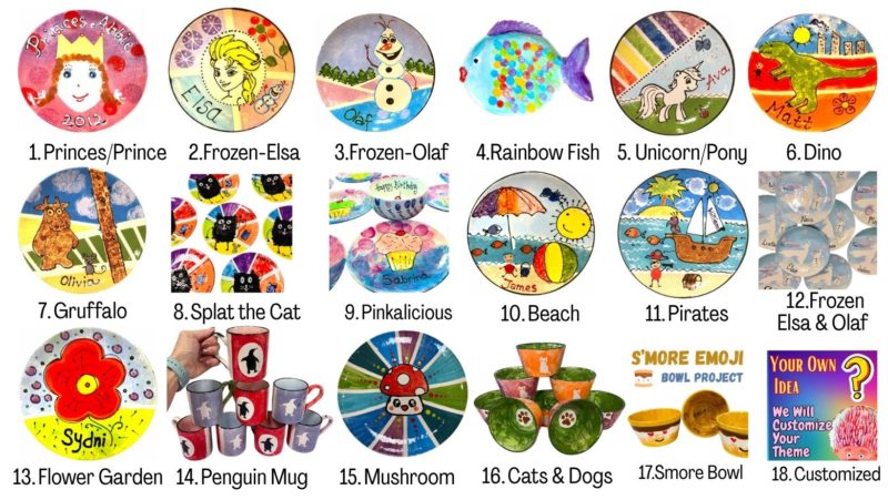 FOOD: Depends on time of your party you may want to provide a different type of fueling for your painters. During our morning parties, bagels are very popular, but lunchtime party screams for pizza from your favorite pizza joint. We are NOT INCLUDING any food items in the price of the party as we would love to leave the choice to you and wouldnât like to sell you unwanted item. However all types of food which do not require refrigeration or heating up are welcome, and our assistants do all the set-up and clean up as well as serve food, cake & drinks, which you provide, so you can enjoy the party.